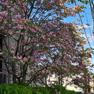 おはようございます🎶🦜🩷 今日のお花🩷ハナミズキベランダからよく見えます 2枚目はサンザシメインで庭から 今日は爽やかなお天気☀ 花探しのお出かけしましょうか ♪(^◇^)♪〜🩷