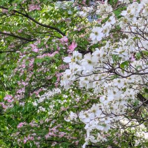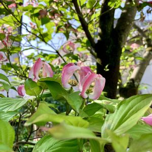 おはようございます😊 散歩道の公園のハナミズキ🌸 白い花の奥にピンクも見えます😊