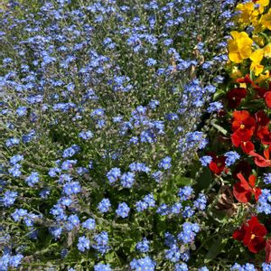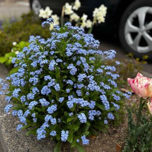 今年のワスレナグサ。 毎年こぼれ種で出てきたのをあちこちに移植して楽しんでいます。 アパートの道路沿いの花壇に植えさせてもらったら、ここだけ肥料が多かったのか隣りのチューリップよりも大きくなってしまいました💧 後ろのデルフィニウムが完全に埋まっちゃってるし、どうしたものか…。 2枚目は3月に移植したもの。一緒に植えたクリーピングタイムがもうすぐ咲くので共演が楽しみです♪