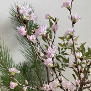 お正月が終わっても松と南天は捨てられず啓翁桜と共に 立春を過ぎた頃に雛飾りを出しました(隣に秋田犬と江戸木目込人形、白鳥…こちらも統一感はないです😅)