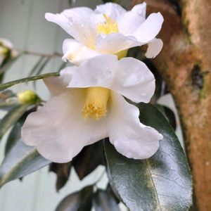 ˳❁˚⌖白侘助⌖˳❁˚ 大好きなお花💕 一重咲き(猪口咲き)で 可憐な白色侘助さん 💛ホソバヒイラギナンテン💛 細葉柊南天 葉っぱとお花の コントラストが綺麗…°✲° 🌿💛🌿💛🌿💛🌿💛🌿