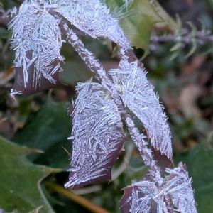 ヒイラギナンテン 葉の上に結晶が煌めく(✪▽✪) 細胞外凍結という現象だ❄気温が上がれば水滴となり、葉は萎れずに復活する /.:°+╰( ˘ω˘ )╯;。:*\ 植栽に好まれるホソバとは違い、庭にあるのは鋭い棘がハッキリとしたヒイラギに葉に似ている💚 葉柄の基部はさや状になって茎を抱いていて、蕾はまだ固くしまっている🟡 ⚠️スズメにだって「ご自身で植えたのですか?」👹 今日の褒め言葉〜ズはスルー&ブロック‼️ ⚠️