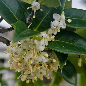 おはようございます🙋♀️ 🏷️今日のお花 ヒイラギ モクセイ科 常緑小高木 ➀白い甘い香りがしました😂 11/28撮影 ②鉢植えのヒイラギ 厄除け用 ③ご近所のヒイラギナンテン黄色い🏵️が塀から覗いてました😂