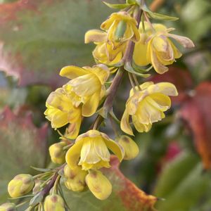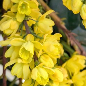 ヒイラギナンテン(柊南天) メギ科 常緑低木で冬の寒さで紅葉する様です。 房咲していますが、アップで見ると1輪がとても美しいです。 (本日黄色のお花2枚目です)