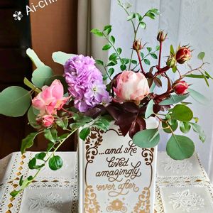 庭の花でアレンジ ・ミニバラ ラブリーモア🩷 ・矮性ストック ベイビーブルーフラッシュ💜🩷 ・ユーカリ ポポラス🌿 ・シマトネリコ🌿 ・コンボルブルス🌿 昨日鉢植えのバラの冬剪定と植え替えを 全部終えました(2つだけですが😅) ①全体像 BOOK型の奥行きのない花器 シマトネリコを花留め代わりに ↙️シマトネリコと似た雰囲気の コンボルブルスの葉を枝垂れさせました ②ミニバラはまだ蕾いっぱいでした🥹 ツヤピカの銅葉も楽しみます♪ ③矮性ストックの真ん中の 最初の1本を切り戻したので ステムが短か過ぎ😂 ④↙️花弁数少なく、傷みが目立つものは あえて顔を外向きに入れました ⑤左斜め上から撮ったら芸術的!?😆 🏷sasukemama倶楽部 🏷19日はピンクの日! 🏷月曜日にはバラを 🏷バラはいいなぁ 🏷月曜日を爽やかに 🏷花咲く乙女たち♡ 🏷スライドショー♪ 参加させて下さい💐( ꈍᴗꈍ)