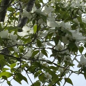 今日のお花 ハナミズキ 我が家のハナミズキは大きくなり過ぎて、目線が上過ぎ〜 ベランダから撮るとこんな感じ 黄色のモッコウバラのアーチ そろそろ散り始めー 🧹🧹