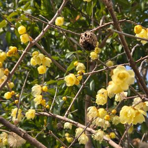 我が家の蝋梅が満開 蝋梅の実 蝋梅のバックは金木犀 蝋梅の前は石蕗の種 蝋梅の花弁はやはりロウソク🕯️のよう 良い香りも漂って... ご近所さんと会話が弾みます♪ヽ(*´∀`)ノ