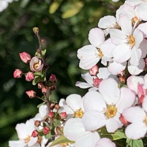 今日のお花🔸ユキヤナギ🔸 ①〜④ 我が家はピンクユキヤナギで、開花が始 まったばかり🥰🎶 膨らんだ蕾がとっても可愛いです🩷 ⑤ レンギョウも咲き始めています🧡