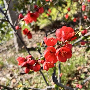 近所の上水公園へ...🚶♀️① ボケに椿にレンギョウに 春の光が暖かく 眩しい位でした✨✨