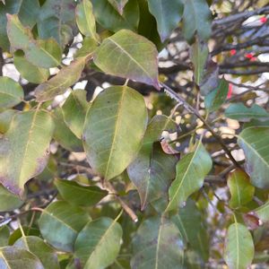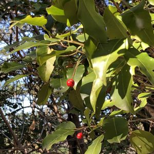 🔴ソヨゴ 少し長めの柄が付いた赤い実が、まばらに付きます。冬でも常緑の葉は、榊の代用として神事にも利用されるそうです。 ⚫︎モチノキ科 モチノキ属 ⚫︎原産 日本 ⚫︎花期 5月〜7月 ⚫︎果期 10月〜11月