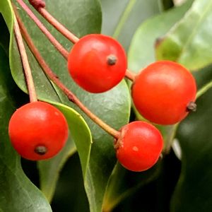 🔴ソヨゴ 少し長めの柄が付いた赤い実が、まばらに付きます。冬でも常緑の葉は、榊の代用として神事にも利用されるそうです。 ⚫︎モチノキ科 モチノキ属 ⚫︎原産 日本 ⚫︎花期 5月〜7月 ⚫︎果期 10月〜11月