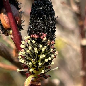 ネコヤナギの雄花序 合着した2本の花糸の先っぽにある赤い葯はまだ熟していません 葯が熟すと黄色い花粉が出ます