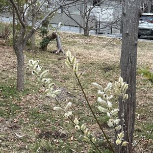 ネコヤナギ お隣りさんの庭 いつものネコヤナギの左隣に黒いネコヤナギが!初めましてです