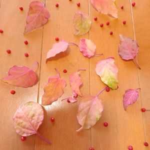 🧡目から暖を🩷3❤ クイズ🎵 何の葉っぱと実でしょーーか? 部屋に暖かい色を取り入れたい❗ と、 紅葉したベランダの植物を活けようとしたら、 実も葉っぱもポロポロポロポロと、、、 正解は ↓ ↓ ②ジュズサンゴでした🥰 落ちた葉っぱと実も一緒に 飾り付け❤🍂❤🍂❤ 花瓶はDAISOで200円の物🎵