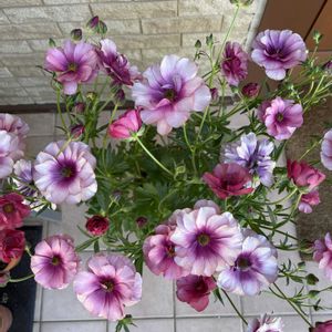 こんばんは♪ 今日は暖かくて気持ちの良い1日でした♬ 雨上がりのお庭です😊 ① 種まきっ子のリビングストンデージー満開になりました🩷💛🤍 ②パンジー&ビオラ、ムスカリのプランターも満開💙💛🧡 ③フリル咲きのパンジーも可愛いです💜💛 ④また多肉の箱庭を作りました🤭 ⑤余ったので小さな箱庭も🐤