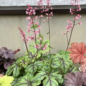 #ヒューケラウィンターベリー #スノーウィーパンキー 葉の模様が美しいですね〜 お花も咲いてもりもり✨ スノーウィーパンキーは、小さくなってます😯 これから暑くなるので上手く夏越しできたら分けて植えたいと思います。