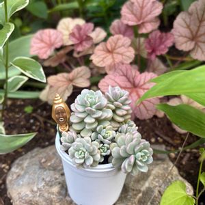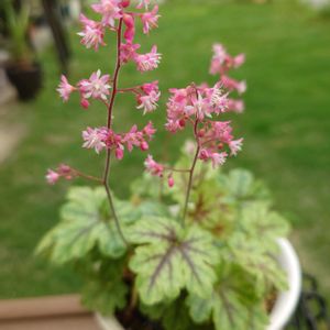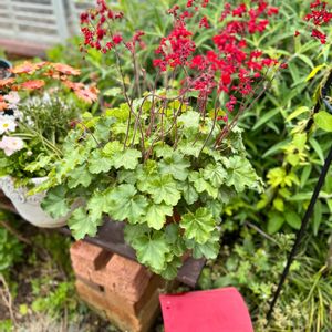 #ヒューケラウィンターベリー #スノーウィーパンキー 葉の模様が美しいですね〜 お花も咲いてもりもり✨ スノーウィーパンキーは、小さくなってます😯 これから暑くなるので上手く夏越しできたら分けて植えたいと思います。