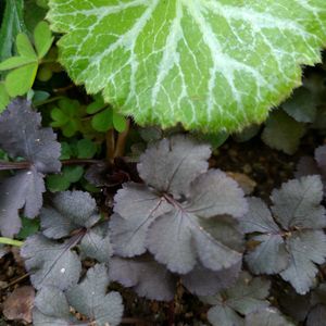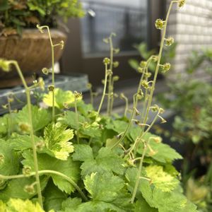 バルコニー小庭の春が一気に進んでおります(ू•ᴗ•ू❁ꔛෆ☔️しとしと降ってくれ(人 •͈ᴗ•͈) ①斑入りの葉が初々しいチャルメルソウ📣📯 ②コタヌキラン。雄花の穂先が筆のよう。雌花は雄花の下にこれから出てくる予定 ③レンゲショウマの芽はかなり展開。株が大きくなってる模様 ④🧠タンチョウソウの花が咲きそろいました。ユキノシタの葉をかき分けて八手葉が出てきています