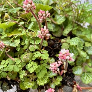 バルコニー小庭の春が一気に進んでおります(ू•ᴗ•ू❁ꔛෆ☔️しとしと降ってくれ(人 •͈ᴗ•͈) ①斑入りの葉が初々しいチャルメルソウ📣📯 ②コタヌキラン。雄花の穂先が筆のよう。雌花は雄花の下にこれから出てくる予定 ③レンゲショウマの芽はかなり展開。株が大きくなってる模様 ④🧠タンチョウソウの花が咲きそろいました。ユキノシタの葉をかき分けて八手葉が出てきています