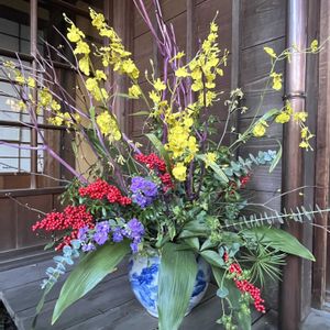 散策路、本日の締めくくりは花束・寄せ植えです。新春らしい彩りにたくさん出合えた1日でした。