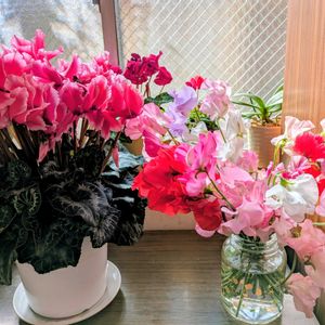 お天気が良いのでお花屋さんまでお散歩兼ねて行って来ました(^-^)💐 スイトピーとアルストロメリアをお連れしました~🩷💕🎶🧚🏻 シクラメンがスゴく元気いっぱいです💐