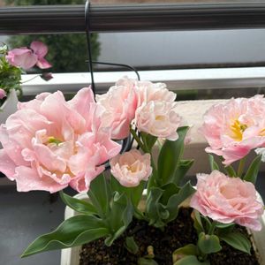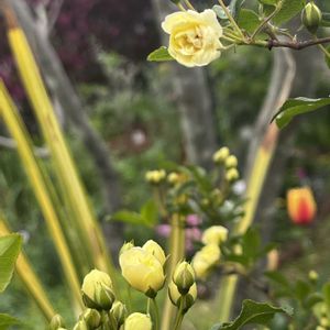 豪雨の後、アメイジンググレイが開花🎶🎶 しかも、アメイジングなラベンダーグレイの八重さんでした☺️✨ ツボミも可愛いポピー 黄色いチューリップは、毎年買ってる富山の福袋に大量に入ってました。 お義母さんの施設に届けます😊