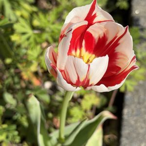 斑入りチューリップ🌷見つけました ➡️葉っぱも斑入り🌿✨➡️お散歩道で出会ったチューリップさん達🌷 🏷️2026チューリップリレー 🏷️春色チュー!チューリップ♡ ほか、いろんなタグ付けさせてくださいね 🏷️2のつく日は斑入りの日 🏷️斑入り見つけ隊♪