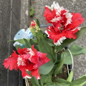 派手なチューリップ🌷が咲きました 赤と白に フリンジが入ってて 見事です☺︎ 風が強いので 1輪だけ 室内に 飾りました 花のある暮らしを この先 ずっと 続けたい☺︎