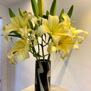 旧正月用にスイセンと一緒に買った「皇帝百合」←って店の名札に書いてあった✨ その名に相応しい咲きっぷり💛 蕾の長さが20cmほど有る巨大な百合です〜✨✨ 水の入った花瓶がとにかくお、重い。。💦
