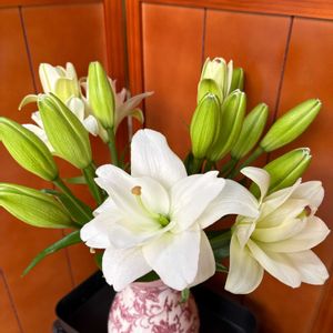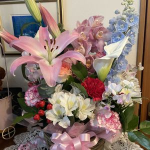 先日、いただいたアレンジメント💖 ユリが全開♪ とっても素敵に✨ 一部枯れたものはお直しして😉 やっぱりお散歩ちゃんと撮らないと! 玄関先にお花があると気分も上がりますね⤴︎