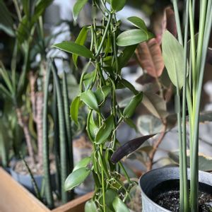🌿バニラ🌿 (ラン科 バニラ属) 去年11月に買って冬越し成功したので喜んでたら春に枯らしてしまったのでリベンジ💪 今は上に伸びてるけど…どうしようかな❓❓ お花屋さんに もうすぐ花が咲くよって言われたけれど…木を大きくしないと咲かないと前に調べた🔍🤣 3年以上✌️ このバニラは 3年生ではなさそうですよね😆頑張ります✌️ 「バニラって書いてあるけど…バニラって何ですか❓」とトンチンカンな質問を花屋さんにしたら😂 「バニラって言ったらバニラですよ」って🤭 ピンとこなくてポカ〰ンとしてました😅🍆〰 ・常緑つる性 ・花は早朝に咲き夜に萎む 5~7cm 香りナシ ・バニラの果実 バニラビーンズ 育てるの下手だから3年では咲かないだろうな…💧まずは枯らさないのを目標だな😄 少しだけツルが伸びた🤣 見て頂いて ありがとうございます🙏💕