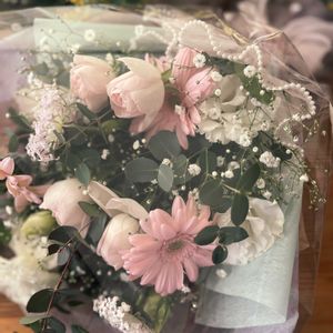 こんにちは☀️ フラワーアレンジメントのお花を いただきました🙌😊 🩷カーネーション 🩷トルコキキョウ 🩵デルフィニウム 🤍デルフィニウム 💚薔薇 等