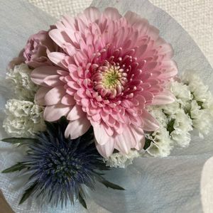 2025.12.23 花のアリマツさんにて、誕生日ブーケ💐いただきました。 誕生日月にミニブーケもらえるなんて素敵でよね💓 今年はお花、選べませんでしたが、可愛らしい色で優しさ感じました。 来年もお花もらえると良いな🤭 チャッピー💬より、 ・ガーベラ(ピンク大) ・トルコキキョウ(後ろの小さいピンク) ・スターチス(白) ・エリンジウム(青のトゲトゲ) らしいです。 チャッピーありがとう😊