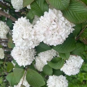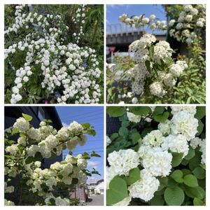 庭の白い花💕 1️⃣2️⃣剪定を失敗してアナベルのように大きくなった大手毬 3️⃣4️⃣大手毬と間違えて植えたビバーナム 華奢なので花が垂れます 咲き始めも大手毬と同じ黄緑色 5️⃣モッコウバラと2ショットの小手毬 共に枝が垂れて咲きます💕