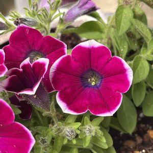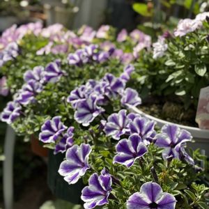 庭の冬越し株開花中です☺️🌸 ①サフィニアアートるりいろ風ぐるま 挿し芽株含め5株ほど生き残りました ②さくらさくら 一気に開花が進んでいます ③ペチュニアフレル 咲き進んできました ④きみどりペチュニア 零れ種のビオラといい感じにコラボしています ⑤カリブラコア 切り戻して植替え後、開花時してきました