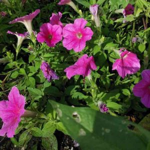 庭の冬越し株開花中です☺️🌸 ①サフィニアアートるりいろ風ぐるま 挿し芽株5株ほど生き残りました ②さくらさくら 一気に開花が進んでいます ③ペチュニアフレル 咲き進んできました ④きみどりペチュニア 零れ種のビオラといい感じにコラボしています ⑤カリブラコア 切り戻して植替え後、開花時してきました
