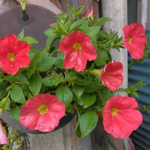 蕾でお迎えしたサフィニア~やっと咲き始めました💠 赤い方はコーラル色と、札にありました 可愛い色です😃