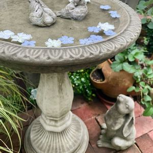 憧れのバードバス🐦⬛🐦⬛🛁 ついにお迎えできました♪ 娘に連れて行ってもらいました ワンダーデコールさん素敵でした♡ 見上げるウサギチャンも一緒に🐇 左足傷めていたのでアウトレット コーナーから♡lucky🙌