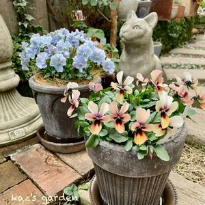 庭のニャンと お気に入りの鉢エリザベスと👑 今年のビオラたち🧡🩵 🏷️ニャンニャン祭り参加です🐾