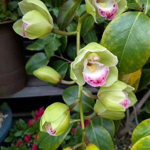 #お友達から送ってもらたpicです🌿 ①🩷 ②シンビジウム🌿💚 ③ストレリチア💛💛 ④君子蘭💛💛 ⑤バイカウツギ🤍🤍