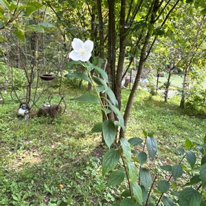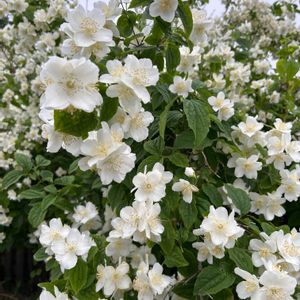 《バイカウツギ》ダンディ邸の庭にて 初夏に白く香りの良い4弁の花を咲かせる落葉低木🌼 その名は花が梅に似ていることや、枝が空洞(空木)であることに由来します🤭 樹形が自然に整いやすく育てやすい点や、高さが2mほどで剪定しやすいことも特徴です🤭🌼