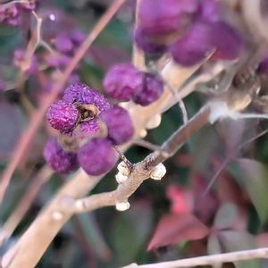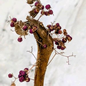 綺麗な赤紫色の実 水分が無くてシワシワです。葉っぱ🌿も全く無くて、何の実なのか見当もつきませんでした💦 検索するとムラサキシキブと‼️ 確かに(コムラサキかもだけど)言われてみれば枝ぶりや、実の付き方はそうです。 乾燥しているだけで、分からなくなるなんて💦 私もお肌の乾燥防がねば😅 髪(葉っぱ)も大事ですよね〜💦 🏷️木曜日は木
