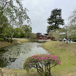 宇治 平等院 ① 阿字池に 少し 白いスイレンの花が咲いてました🤍🍀 枝垂れ桜も 葉ざくらに🌿 ②新緑が美しく💚✨ ③六角堂の周囲も 青モミジが目に優しい☘️ ④ 茶房 藤花(TOKA) 入り口前に 鉢物の藤の花など置いてありました🪴🪴 茶房で 温かい宇治抹茶🍵菓子😋 ⑤ 六角堂と阿字池の近くの松 これは何だろうな?😉 4/19 📱