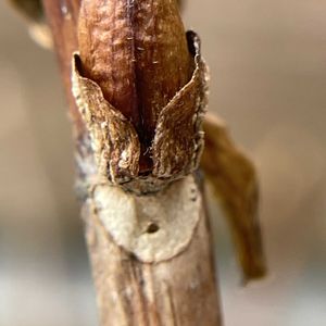 ガクアジサイ 頂芽は裸芽で、長さ1〜2cmの長卵形。 側芽は長さ3〜13mmで2個の芽鱗に包まれる。葉痕は三角形〜ハート形。 維管束痕は3個。 花の咲く時期は5-6月。