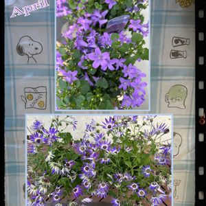 【ベルフラワー、セネッティ、アジサイ、クレマチス】 えっー もう4月 今月もよろしくお願いします🤗 最初のお花は、園芸店の見切り品 こんなに可愛いのに💜💜 引越しで出てきたスヌーピーのクロスを敷いて〜🐶 あとは、とっても豪華なお花たち💜💜 みんな素敵な大好きな紫花です😊
