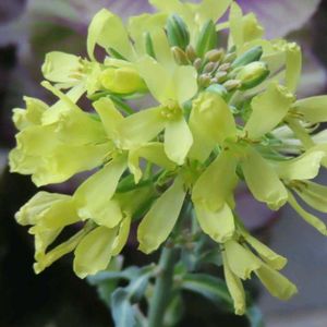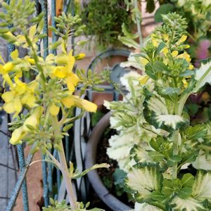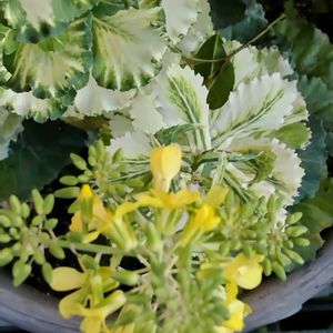 🍃ハボタン(の花)🌿 今頃になって、ハボタンが黄色の花を付けました。何でですかね⁉️ 周りの色鮮やかなビオラ(紫)やナデシコ(ピンク)にかなり押され気味です😅