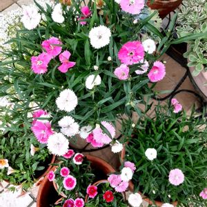 🌺四季咲きナデシコ🌺 1️⃣色変わり種と覆輪種🌸 2️⃣寄せ植えでも主役級、脇役にはビオラ、セダム、ローズマリー、ハボタン(黄色の花)、カリブラコアと多彩な顔合わせ🍀 何処に誰がいるか、わかるかな⁉️