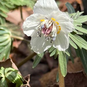 セリバオウレン 雨の中、いつもの小さな斜面でセリバオウレンが咲いている 水滴の水曜日🏷 ふっくらとした雄しべは花糸も葯も白く、裂けない間は薄ピンクに見える🩷 両性花は雌しべがあって、小豆色をしたツノの先が外側に曲がっている💜 外側に長く伸びているのは萼片で、内側にあるやや小さなヘラ型をしているのが花弁⦿ セツブンソウも同居している 白い水曜日♡🏷