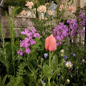 夜の花壇もかわいい🩵 私の癒しの場所です。 このチューリップ10本植えて2本しか咲いてくれず…葉っぱは出るけど茎が上がってこない( ; ; ) 水不足だったのかな?ガッカリです🥲