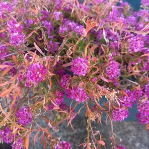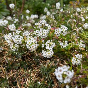 スイートアリッサム 昨年夏からずっと咲いています。えらい👏 葉っぱは秋に紅葉しました。枯れているのではありません。